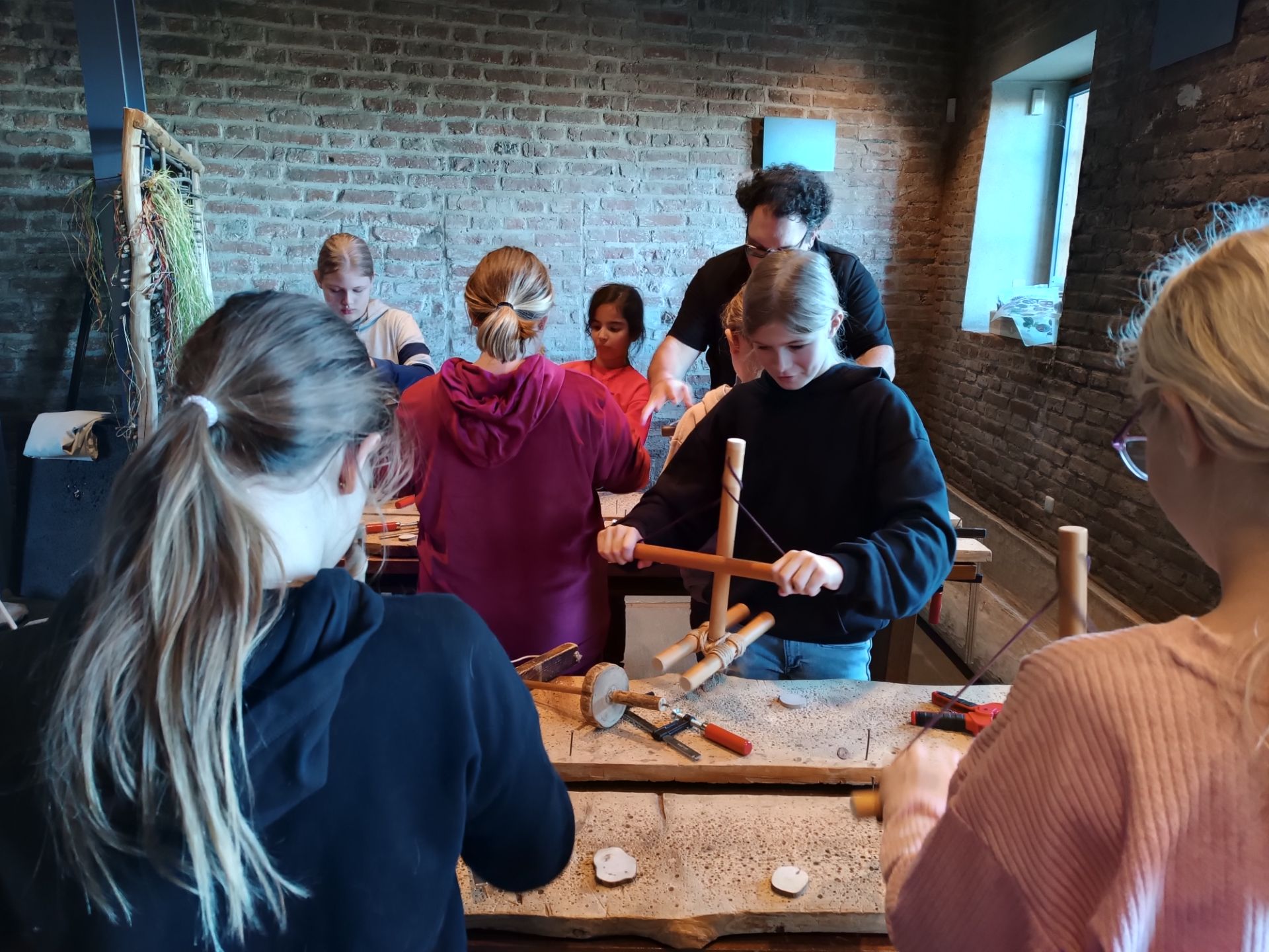 Im Workshop gestalteten wir einen Anhänger aus Holz. Dabei benutzten wir authentische steinzeitliche Werkzeuge. Wir verzierten unsere Schmuckstücke mit Muscheln und Perlen und drehten eine Kordel aus Bast.