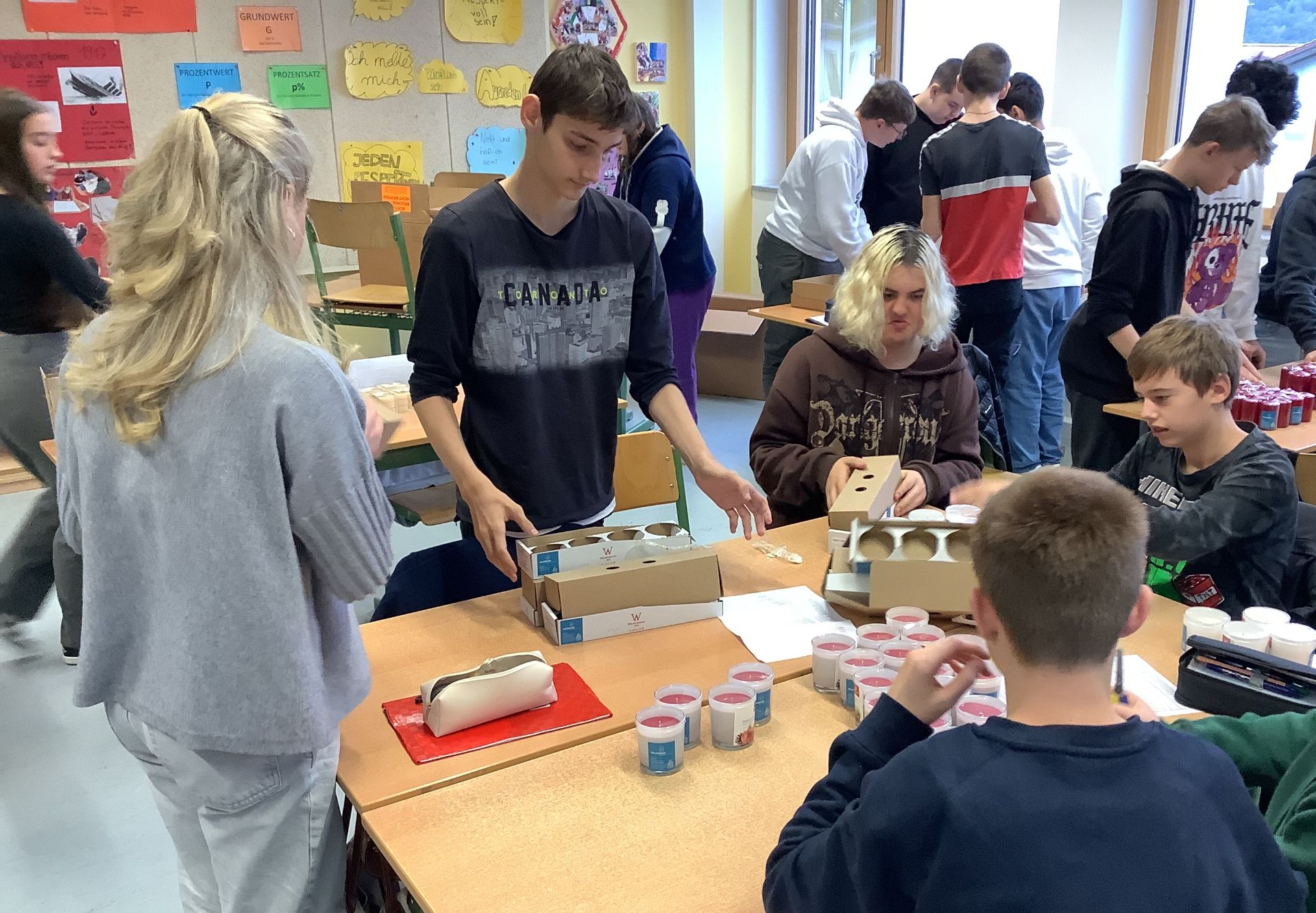 Die Klasse 8m der Mittelschule St. Georg beteiligte sich auch dieses Jahr mit Klassenleiter Hans Weber an der Aktion „Lichter für den Frieden“ des „Volksbunds Deutsche Kriegsgräberfürsorge“. An unserer Schule wurde auch heuer wieder fleißig bestellt, so dass eine stolze Summe von 850 Euro für die Pflege und Instandhaltung von Kriegsgräbern in Bayern zusammenkam. Wie jedes Jahr übernahmen die Schülerinnen und Schüler die Verteilung der Flyer und Klassenlisten, über den Sinn und Zweck der Aktion wurde nachgedacht und in den Klassen aufgeklärt. Am Tag der Lieferung mussten die schweren Kartons ins Klassenzimmer gebracht werden. Es folgte das Auspacken und Sortieren der über 200(!) Kerzen und Kerzenpackungen. Nach Überprüfung auf Vollständigkeit konnte für jede Klasse, die sich an der Aktion beteiligt hatte, ein „Lieferkarton“ zusammengestellt und übergeben werden.