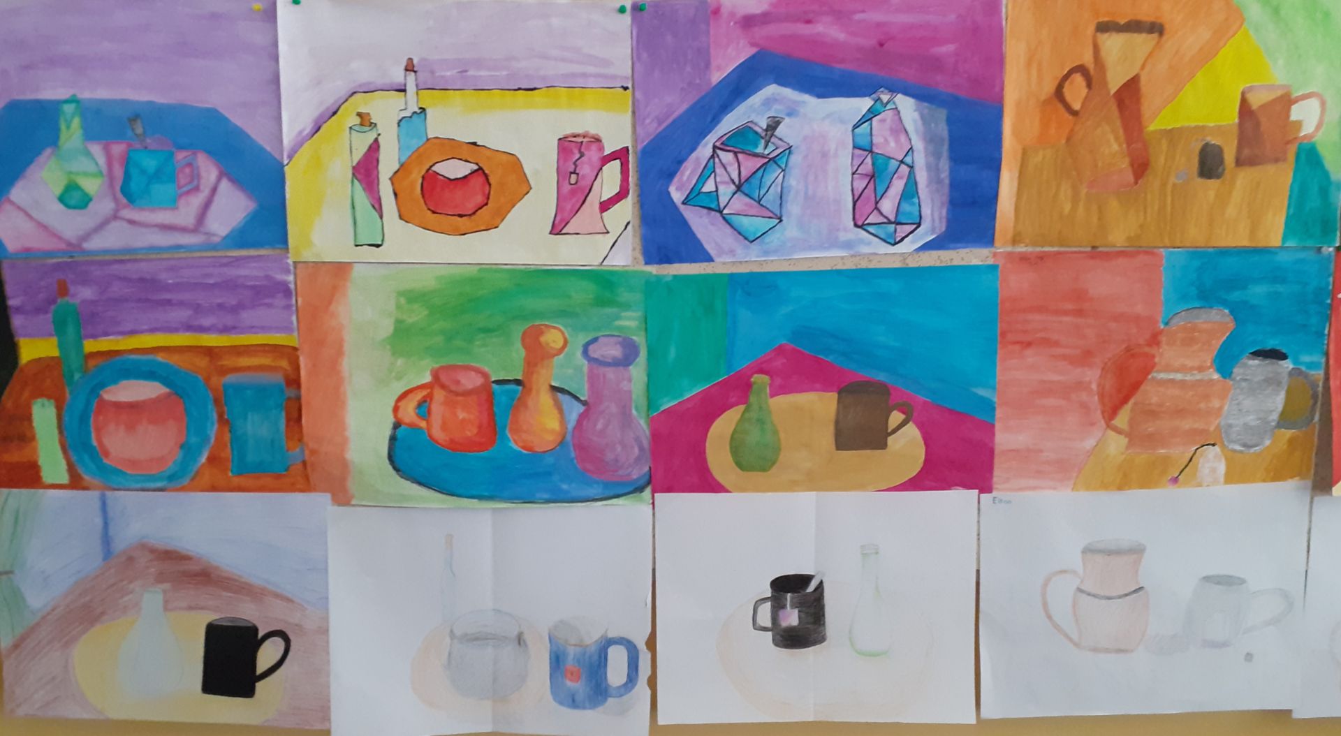Gleich drei Mal widmeten sich die Schüler der Klasse 9m dem gleichen Motiv. Ein selbst erstelltes Stillleben sollte zunächst möglichst realistisch widergegeben werden. Dabei musste man auf kleine Details, Formen sowie Licht und Schatten achten. In einem zweiten Schritt setzte man die in der Theorie erlernten Inhalte zum Expressionismus in einer Wiederholung des Stilllebens um. Wichtig wurde nun die Farbgebung, die Formensprache und der Ausdruck des Bildes. Beim dritten Versuch wagte man sich an die großen Vorbilder des Kubismus wie Pablo Picasso oder George Braques. Die geometrische Gestaltung, die kantigen Formen waren zunächst gewöhnungsbedürftig, konnten dann aber rasch umgesetzt werden. Ein kleiner Vergleich der drei Werke im Klassenzimmer zeigte den Schülern dann auch die schnelle positive Entwicklung ihrer künstlerischen Fertigkeiten. Ganz nebenbei lernte man auch noch über moderne Strömungen der Kunstgeschichte hinzu.