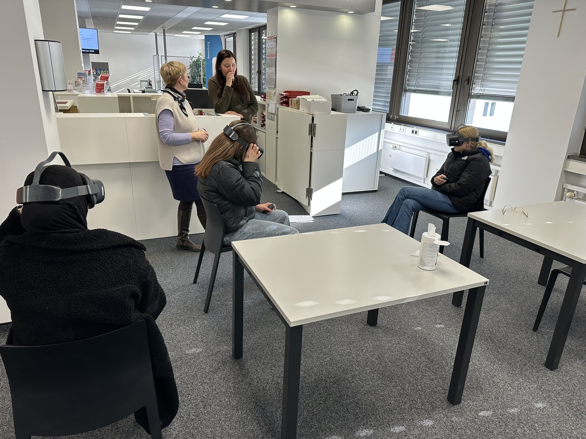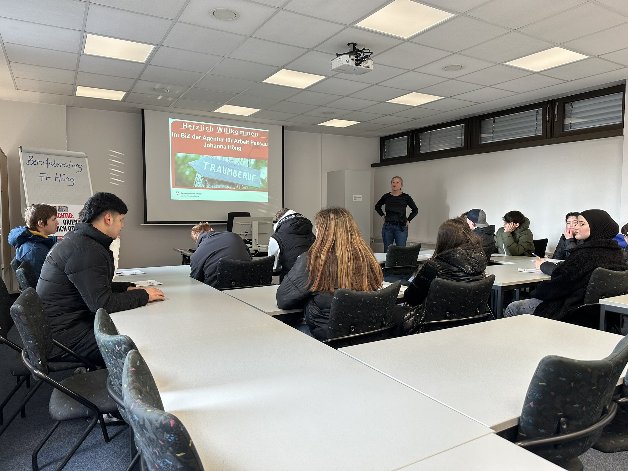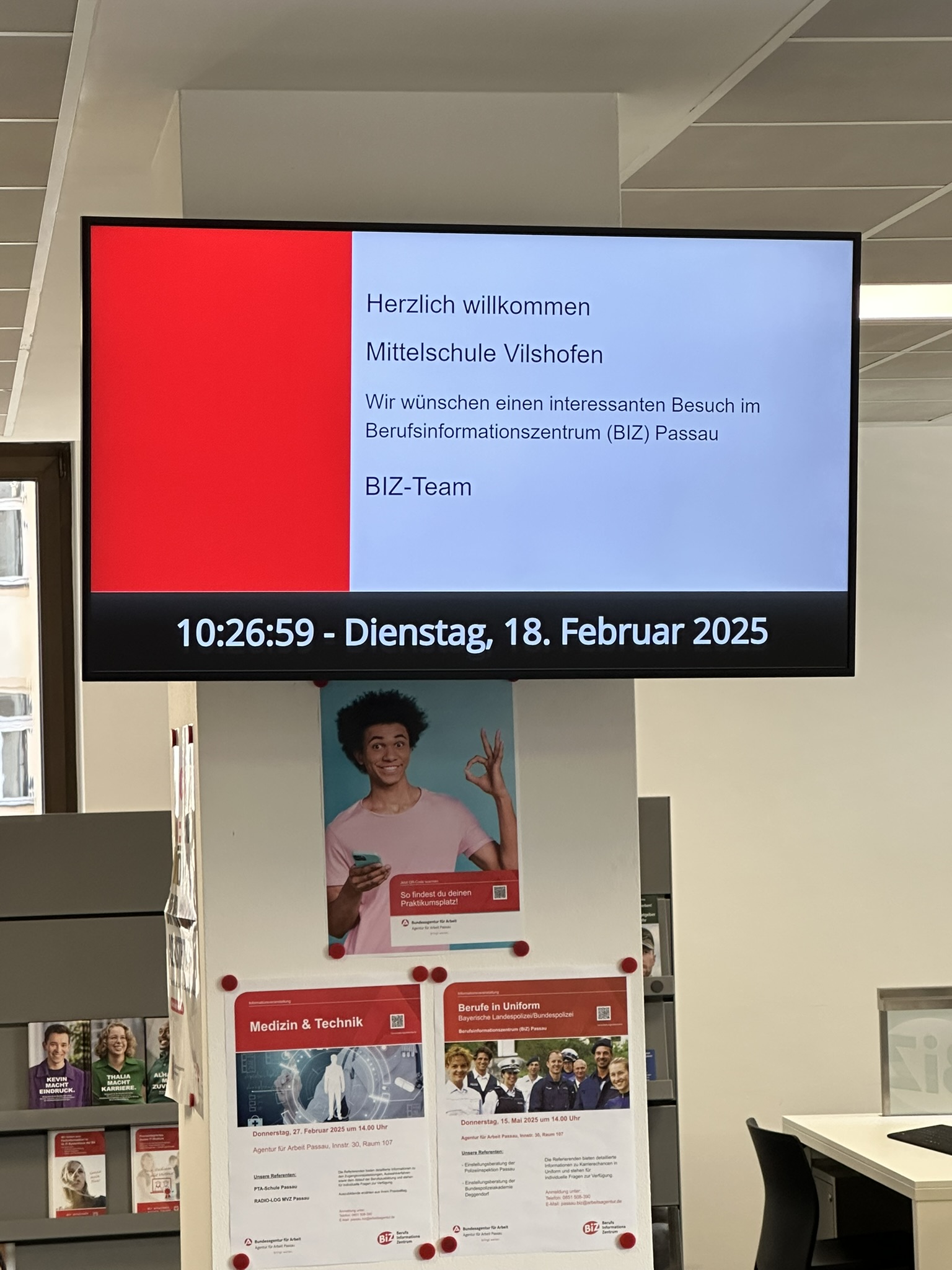 Um zu zeigen, wie man bei der Suche nach einem geeigneten Ausbildungsberuf richtig vorgeht, besuchte die Klasse mit ihren Lehrkräften Schöfberger und Marcu das Berufsinformationszentrum (kurz BIZ) der Bundesagentur für Arbeit. Dort wurden sie von der für die Mittelschule Vilshofen zuständigen Berufsberaterin Johanna Höng in Empfang genommen und nach einem kurzen theoretischen Teil, wie es denn nach der Schulzeit weitergeht, direkt ins BIZ geschickt. Neben einem Test, in welchem die Schülerinnen und Schüler ihre Stärken und Schwächen überprüfen konnten, gab es als Highlight auch VR-Brillen, mit denen man realitätsnah diverse Berufe erkunden konnte. Auch wurden verschiedene Portale zur Jobsuche vorgestellt, damit man so schnell und einfach wie möglich einen passenden Ausbildungsplatz findet.