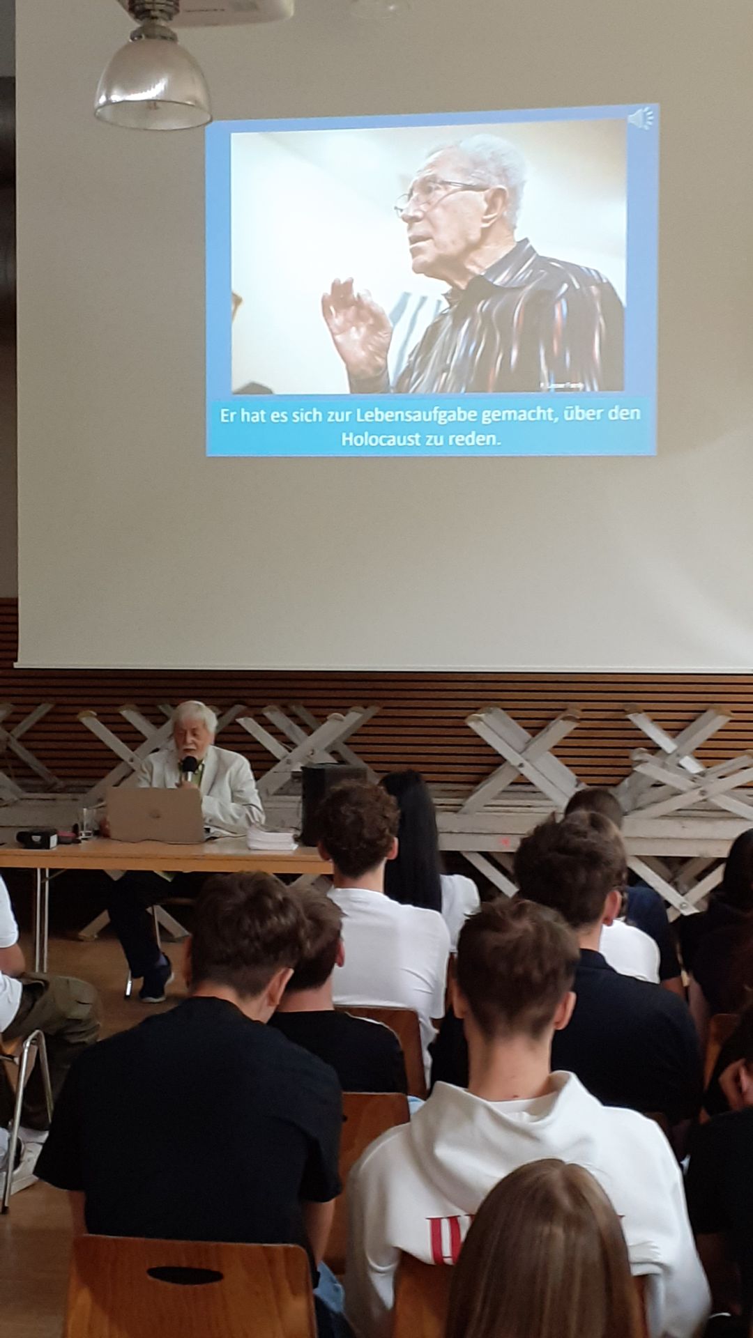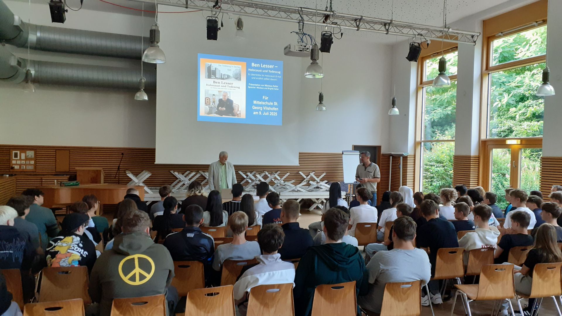 In mehreren Videos konnten die Schüler Ben Lesser, der heute in Las Vegas lebt, hören und sehen. Er hat es sich nach seinem Ruhestand zur Aufgabe gemacht, von seinem Schicksal zu berichten. Dies hat der Referent Nikolaus Saller den Schülerinnen und Schülern in seinem Vortrag eindrücklich dargestellt. Auch das versöhnliche Fazit Lessers – „Ich liebe die Deutschen. Nazis hasse ich. Aber ihren Kindern kann ich keinen Vorwurf machen“ – beeindruckte.