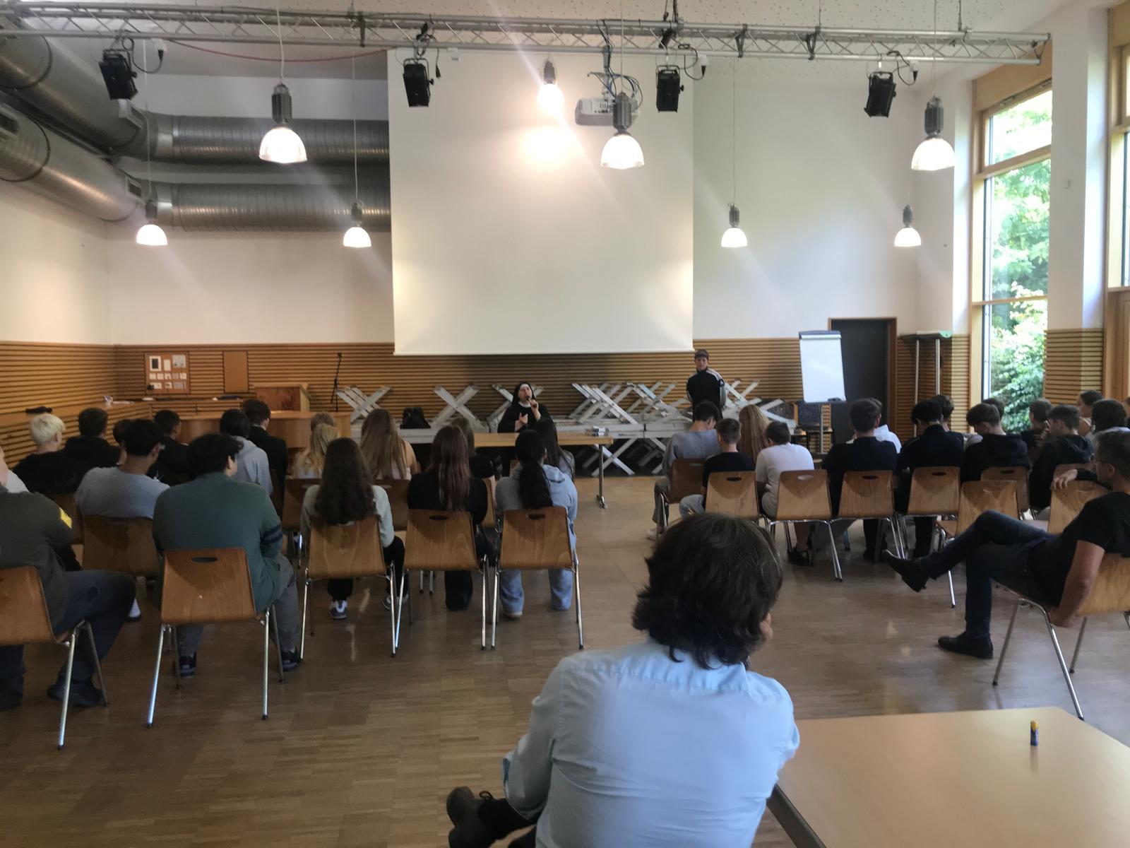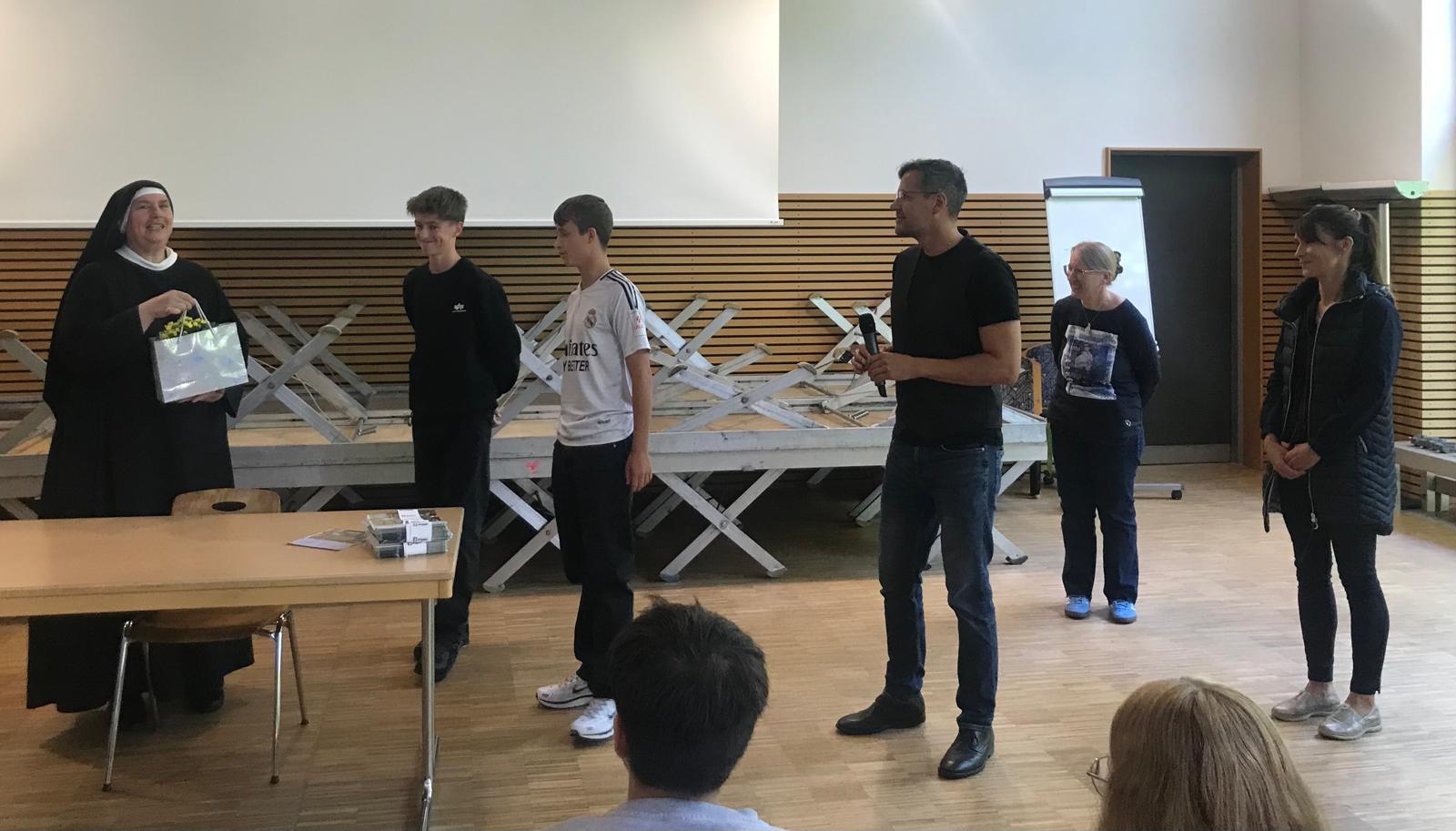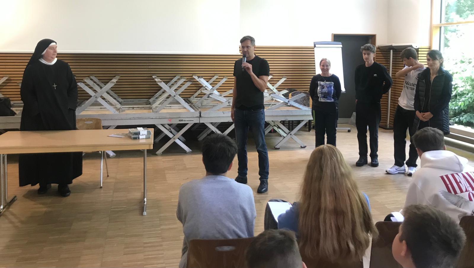 Die Klassen 8a und 8b hatten Mitte Juli besonderen Besuch: Schwester Magdalena von den Benediktinerinnen der Anbetung Neustift stellte sich einer Fragerunde der Mädchen und Buben über das Leben im Kloster Sankt Scholastika. Zunächst erzählte sie den beiden Klassen, dass sie bereits seit 22 Jahren Benediktinerin ist. Das Leben der Ordensfrauen ist von den täglichen Zeiten des Stundengebets geprägt. Der Tag von Schwester Magdalena beginnt deshalb bereits um 6 Uhr. Gemeinsam mit ihren Mitschwestern betet sie die Laudes. Anschließend geht jede Schwester ihrer beruflichen Tätigkeit nach, bevor es um 12 Uhr wieder mit der Mittagshore weitergeht. Neben dem täglichen Stundengebet liegt ein spiritueller Schwerpunkt der Ordensfrauen auf der eucharistischen Anbetung. Dabei wird der Leib Christi in einer goldenen Monstranz von den Schwestern im Gebet verehrt. Neben dem Alltag im Kloster schilderte Schwester Magdalena in eindrucksvoller Weise auch ihren persönlichen Lebensweg. Ursprünglich stammt sie aus der Oberpfalz und führte dort ein ganz „normales“ Leben, bevor sie sich mit 36 Jahren zum Leben als Nonne berufen fühlte. Ihre erlernte Tätigkeit als Heilserziehungspflegerin übte sie in der Heimvolksschule Fürstenzell noch viele Jahre nach ihrem Eintritt aus. Die Arbeit mit Jugendlichen und Kindern erfüllte sie mit großer Freude. Anschließend eröffnete die Ordensfrau im Kloster Neustift eine Töpferei. Mit viel Sorgfalt und Liebe zum Detail fertigt sie bis heute kleine Kunstwerke wie Kreuze und Figuren aus Ton an. Die Schülerinnen und Schüler stellten Schwester Magdalena zahlreiche Fragen und zeigten sich von ihrer charismatischen, warmherzigen sowie authentischen Art sehr begeistert. Für die beiden 8.Klassen wurde gelebter Glaube so spürbar und erlebbar.