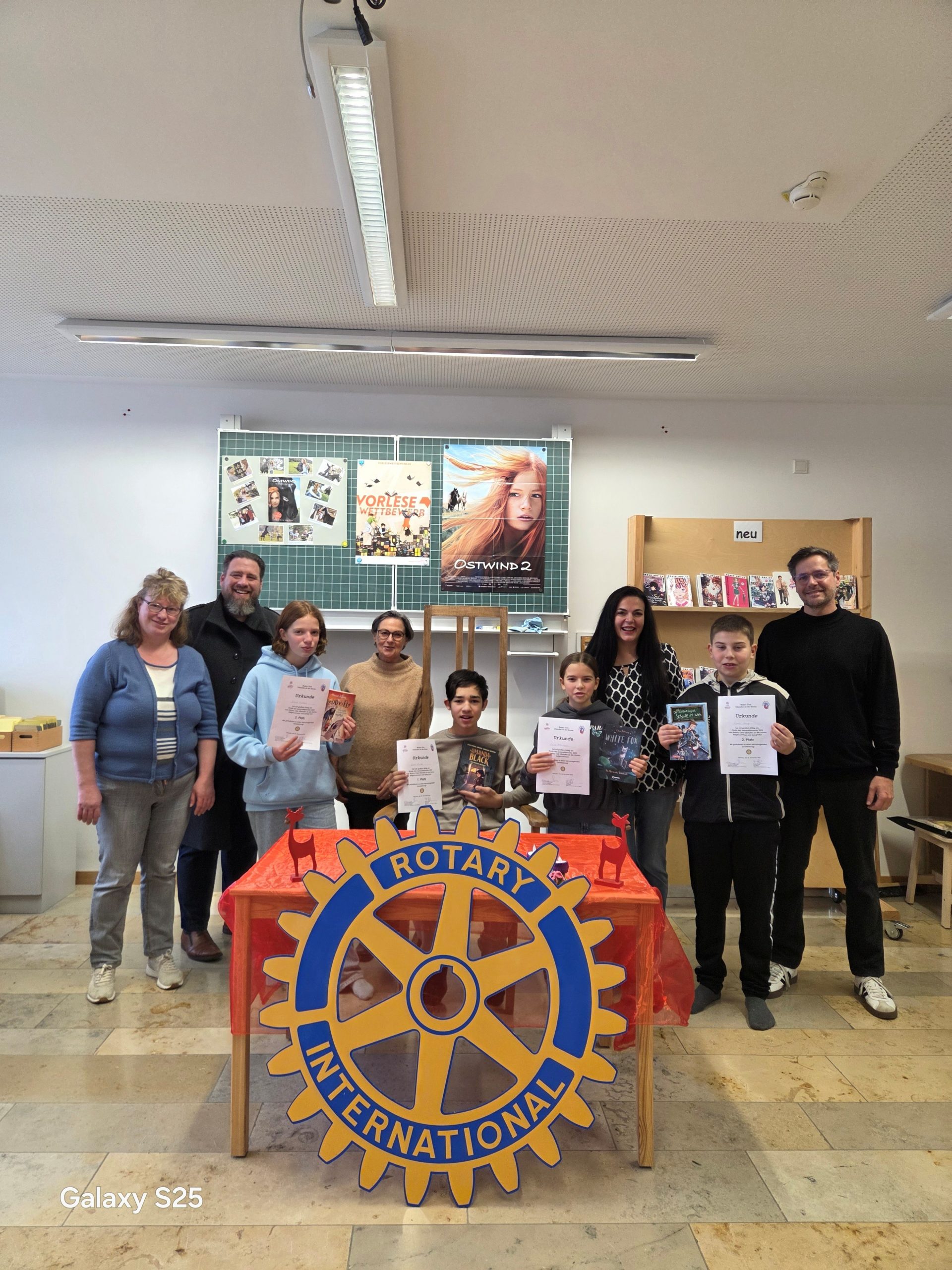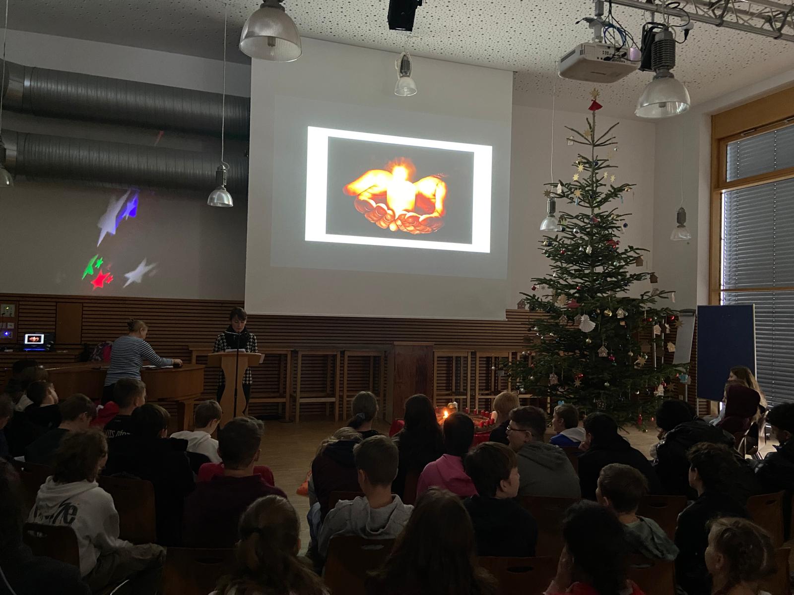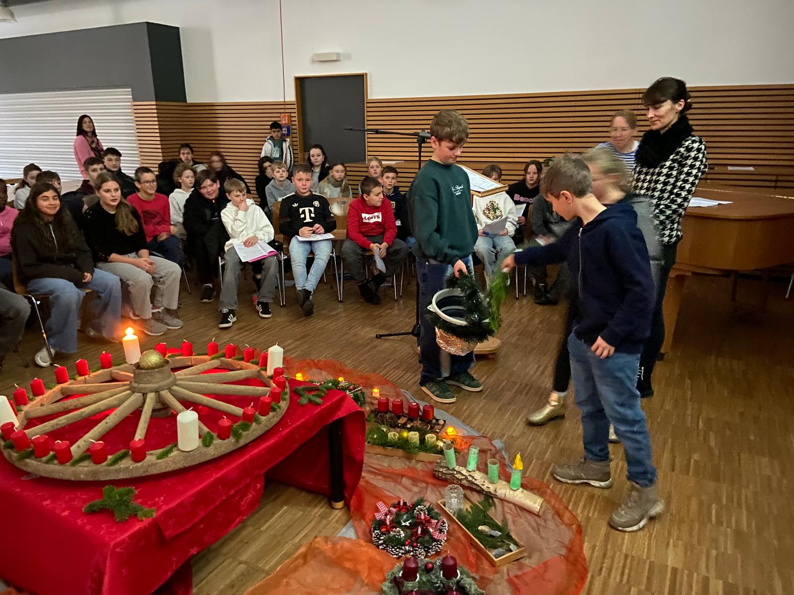 Am Montag nach dem ersten Advent trafen sich alle Klassensprecher unserer Mittelschule zur Adventskranzsegnung in der Mensa. In der Mitte hatten Schülerinnen und Schüler der Klassen 5c und 5d auf einem alten Wagenrad 24 rote sowie vier große, weiße Kerzen gemäß dem Vorbild des ersten Adventskranzes aufgestellt. Dieser wurde vom evangelischen Pfarrer Johann Hinrich Wichern erfunden, der Ende des 19. Jahrhunderts in Hamburg ein Waisenhaus leitete. Um den Waisenkindern das Warten auf Weihnachten zu verkürzen, stellte Pfarrer Wichern diese 28 Kerzen, eine für jeden Tag im Advent, auf das Wagenrad. Übrig blieben vier Kerzen für die vier Adventssonntage wie wir sie heute auf einem Adventskranz finden. Lesung und Fürbitten sowie die Segnung der Adventskränze übernahmen Schülerinnen und Schüler der Klasse 5b. Zum Schluss der Andacht wurde auf jedem der Adventskränze der einzelnen Klassen das erste Licht entzündet und den Klassensprechern in die Klassen mitgegeben. Außerdem bekam jede Klassensprecherin und jeder Klassensprecher eine auf leuchtendem Papier kopierte Kerze mit seinem Namen darauf mit, über der das Motto der Adventskranzsegnung „Light on – Licht sein für andere“ geschrieben stand. Die beiden Religionslehrerinnen Frau Uttenthaler und Frau Zdralek wollten den Kindern und Jugendlichen damit die Botschaft vermitteln, dass wir alle durch gute Taten und Einfühlungsvermögen ein Licht für unsere Mitmenschen sein können.